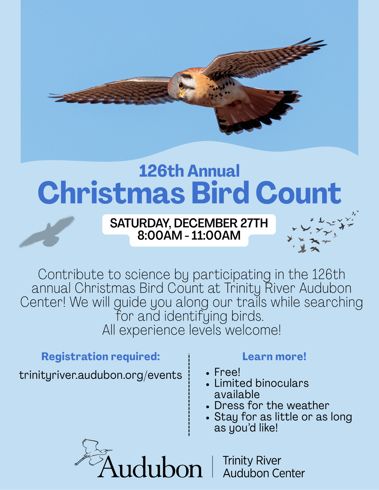 Contribute to science by participating in the 126th annual Christmas Bird Count at Trinity River Audubon Center! We will guide you along our trails while searching for and identifying birds. All experience levels welcome!